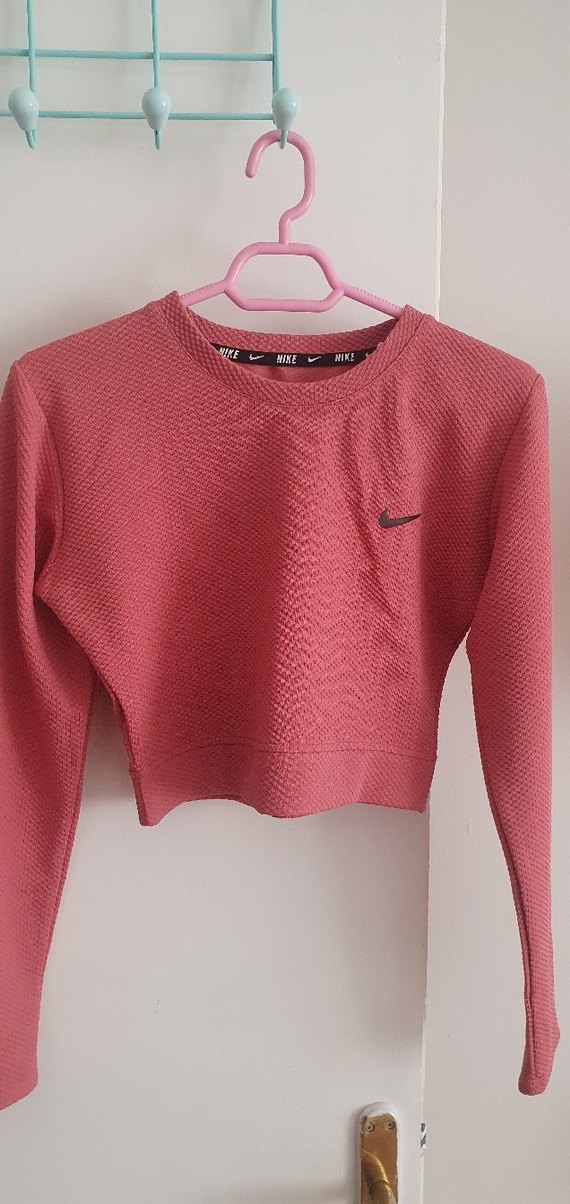 Nike marka, uzun kollu, yuvarlak yaka, triko dokulu, parlak pembe renkte, dar kesim kısa sweatshirt.