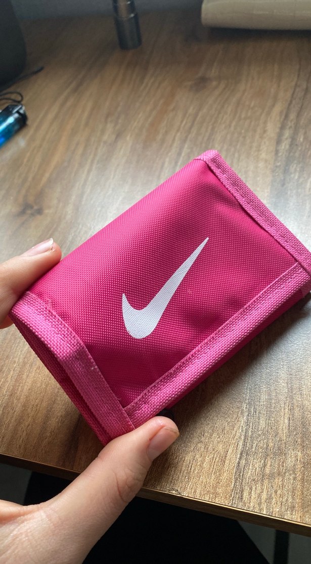 Pembe Nike cüzdan, sağlam sentetik kumaştan yapılmış ve cırt cırtlı kapanışı vardır. Parlak yüzeyi ve sade tasarımıyla spor ve sokak stiline uygundur.