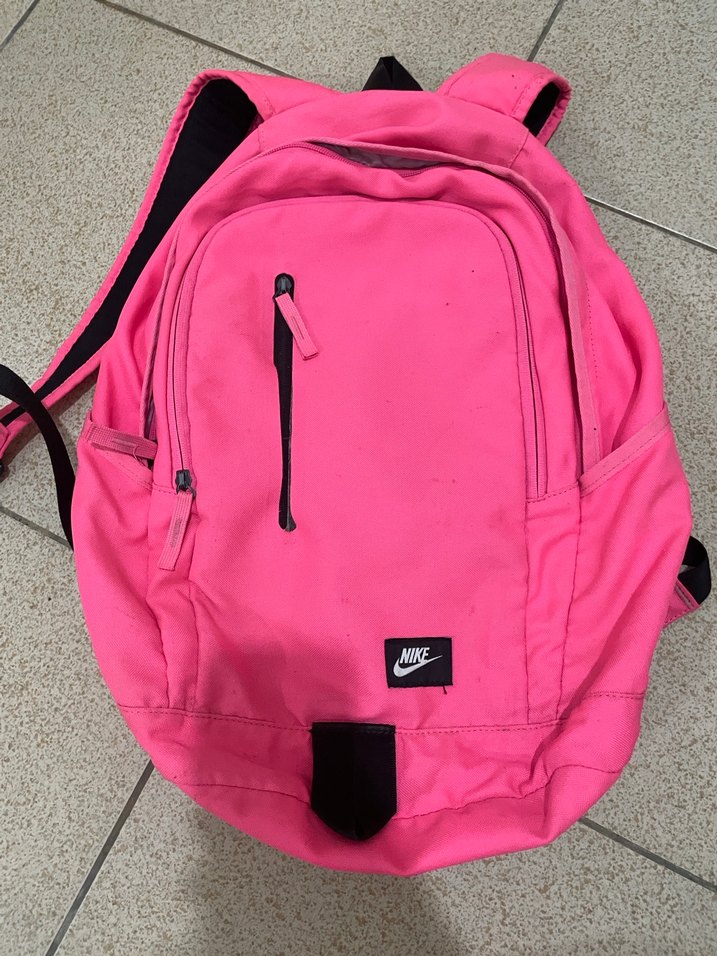 Pembe Nike sırt çantası, fermuarlı bölmeleri ve sentetik kumaşıyla spor ve sokak giyimine uygundur. Defosu yok orijinal