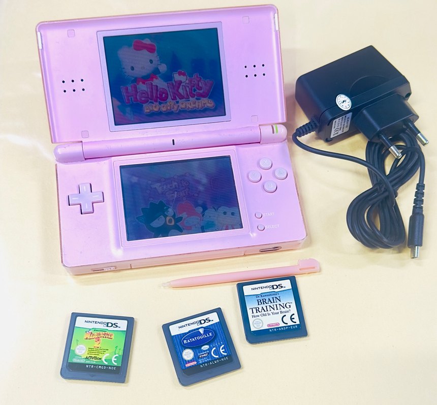Pembe Nintendo DS el konsolu, kalem ve Brain Training ile Hello Kitty oyun kartları dahil 4 oyun kartı. Şarj cihazı ile birlikte.