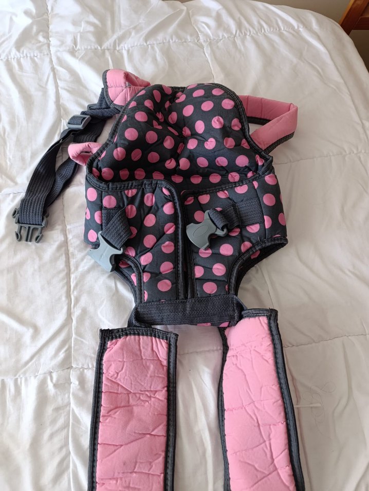 Ayarlanabilir kayışlı, koyu pembe puantiyeli bebek taşıyıcı.
