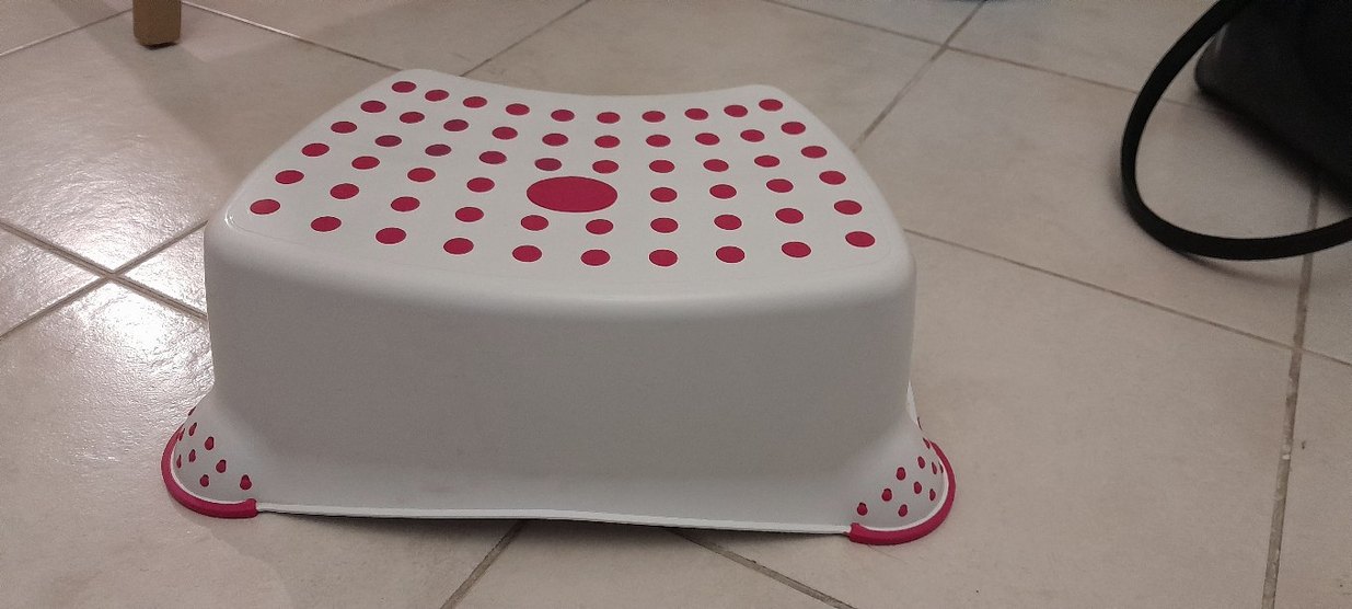 Beyaz taban üzerinde pembe puantiyeli, çocuklar için tasarlanmış renkli bir çocuk sandalyesi.