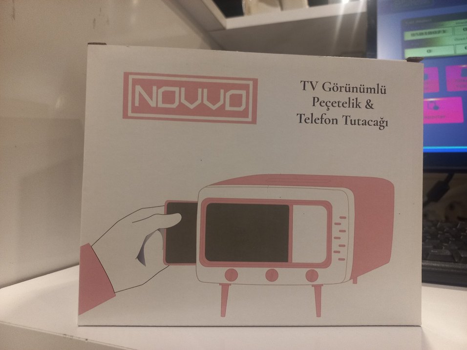 Pembe NOVVO mini projeksiyon cihazı, TV görüntüsü, peçetelik ve telefon tutucu özelliklerine sahip kompakt tasarıma sahiptir.