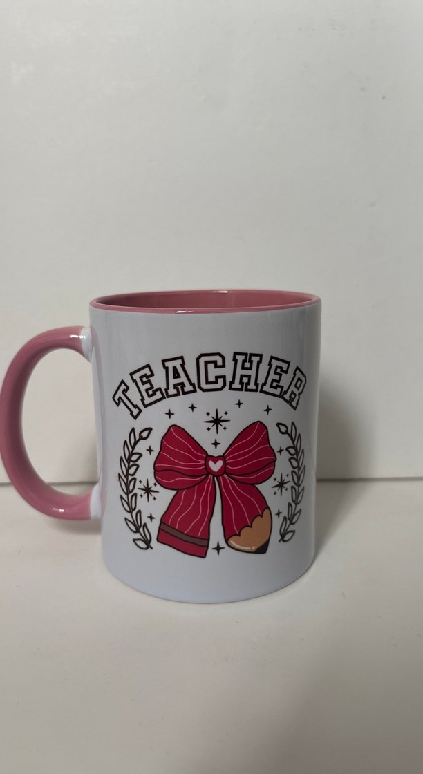 Pastel pembe kulp ve iç kısmı olan porselen kupa, önünde kurdele ve "TEACHER" yazısı bulunur.