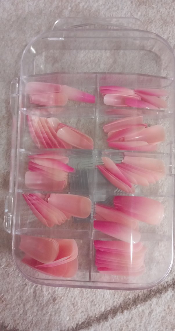 Farklı boyutlarda açık pembe ombre tırnak süsleri şeffaf kutuda, tırnak süslemesi için uygun.