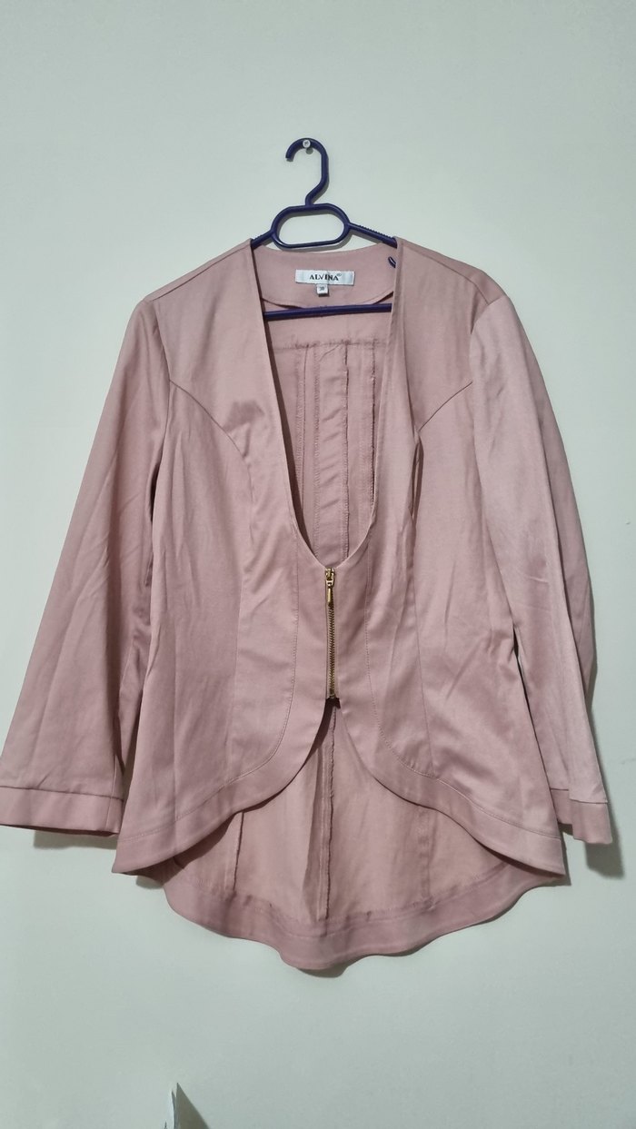 Pembe pastel renkte, uzun kollu, kapamalı, regular fit midi ,önden ve arkadan fermuar detaylı şık ceket. Ofis için uygundur.