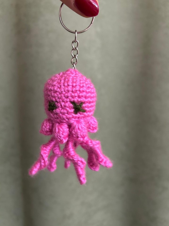 Renkli pembe örgü ahtapot figürlü anahtarlık, rahat ve gotik tarzıyla dikkat çekiyor. Rock punk havası için uygun.
