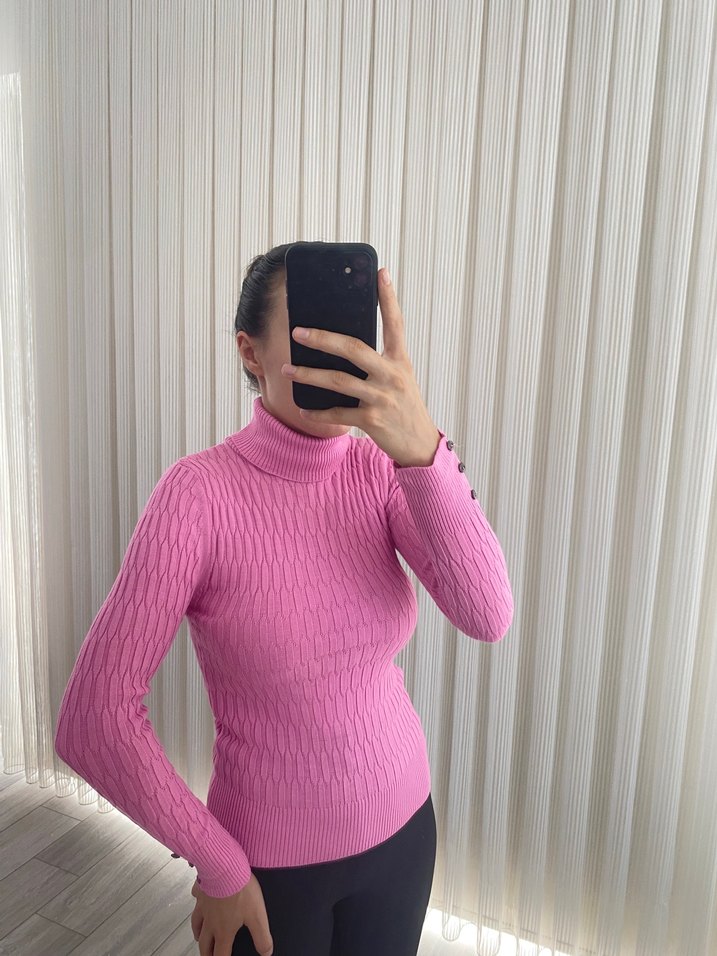 Bu pembe örgü kazak, balıkçı yaka ve düğmeli uzun kollara sahip, yumuşak örgü kumaştan rahat bir kullanım sunar.