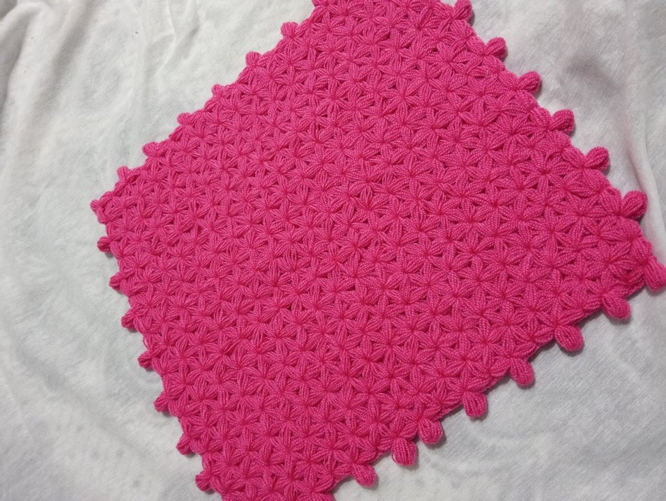 Canlı pembe renkte, dokulu örgü tasarımlı banyo lifi. Yumuşak ve dayanıklı,