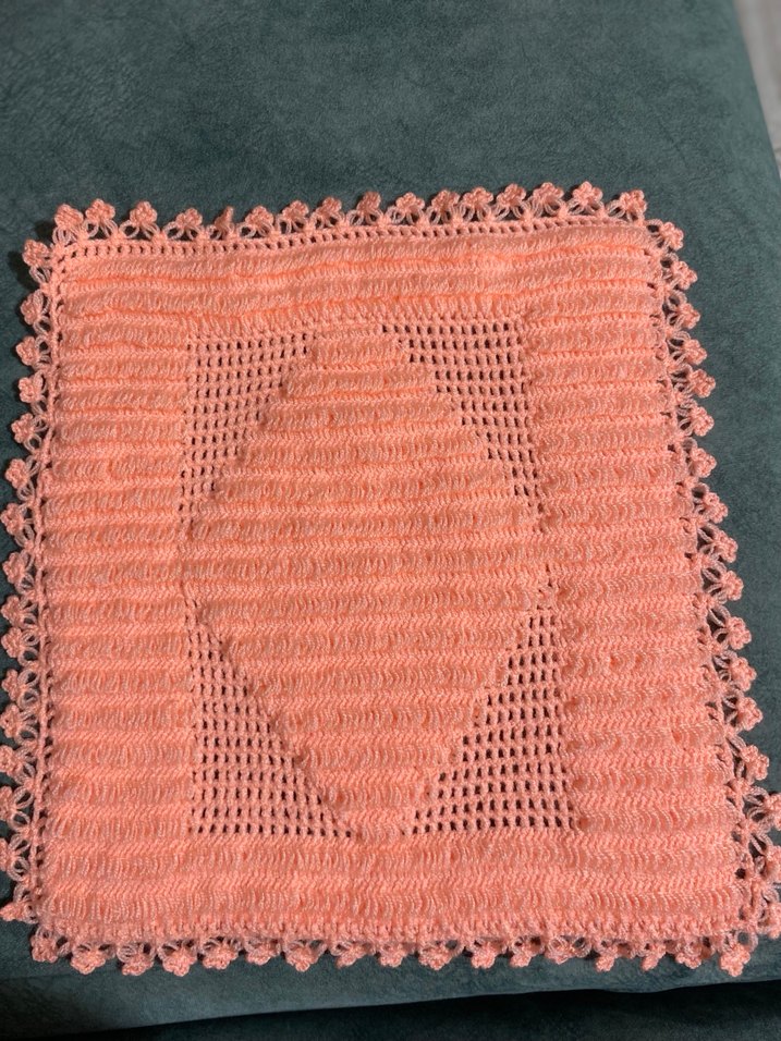 Renkli, detaylı örme desene ve süslü kenarlara sahip pembe banyo süngeri. Banyo sırasında nazikçe peeling yapar.
