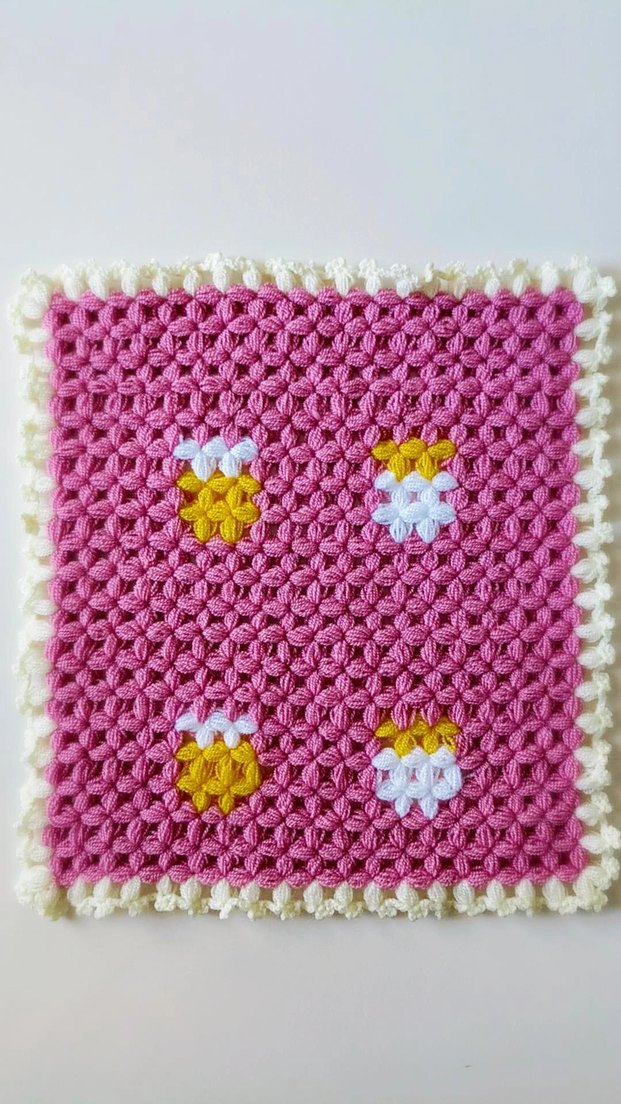 Renkli pembe örgü dokulu, beyaz kenarlıklı ve küçük desenli banyo süngeri. el emeği marka temsilidir