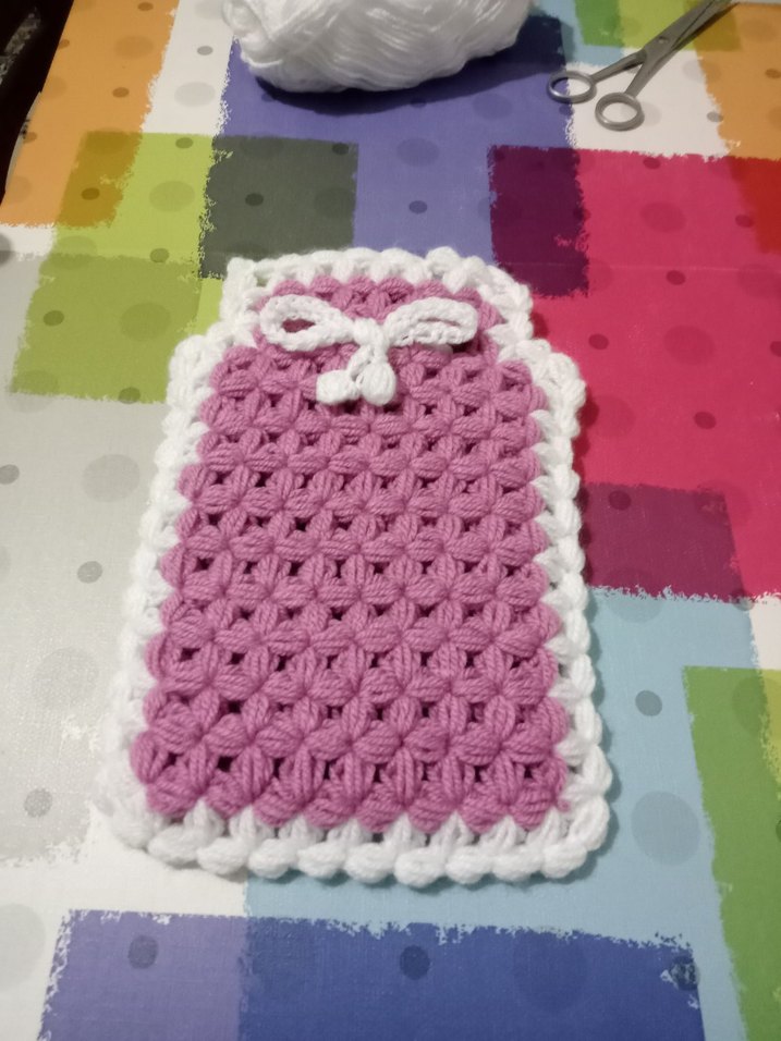 Pembe renkli, beyaz kenar ve fiyonk detaylı, el örgüsü banyo süngeri, nazik bir peeling sağlar.