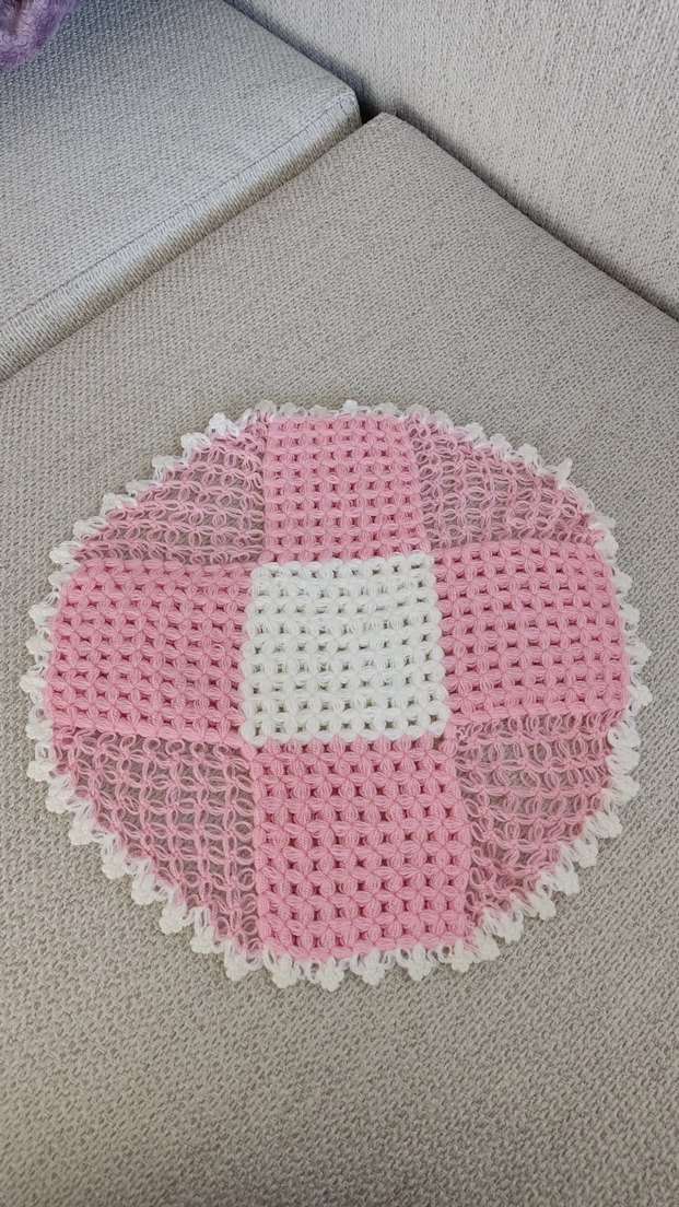 Beyaz merkezli ve dekoratif kenarlıklı, pastel pembe örgü banyo lifi. Hiç kullanılmadı. 36 cm genişliğinde