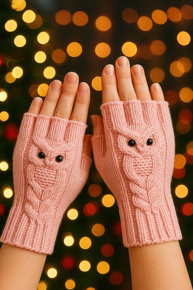 Pembe Örgü Baykuş Desenli Kadın Eldiveni