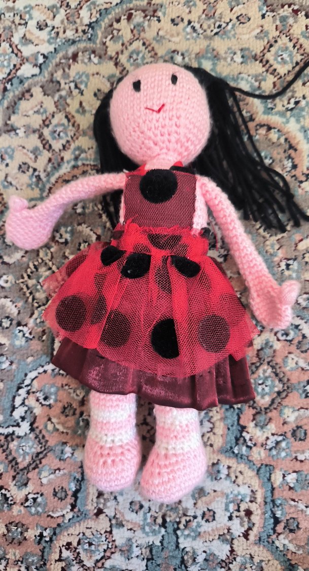 Siyah saçlı, siyah benekli renkli kırmızı elbise giymiş pembe örgü bebek. Yumuşak ve detaylı tasarım.