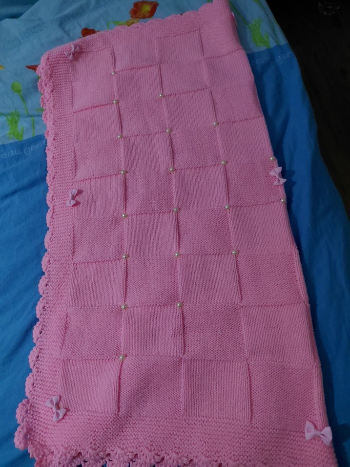 Pastel pembe renkte, örgü bebek battaniyesi. Düz desensiz, fiyonk detayları ve dantel kenar süslemeli.