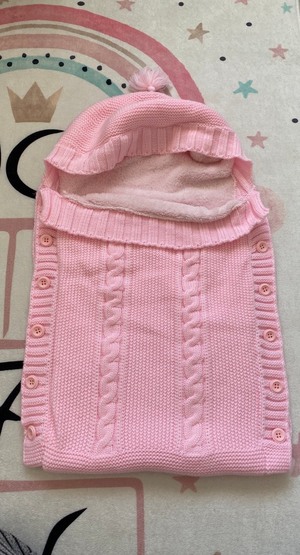 Pastel pembe renkte, kapüşonlu ve düğmeli yan detaylı örgü bebek battaniyesi, yumuşak iç yüzeyiyle sıcaklık sağlar.