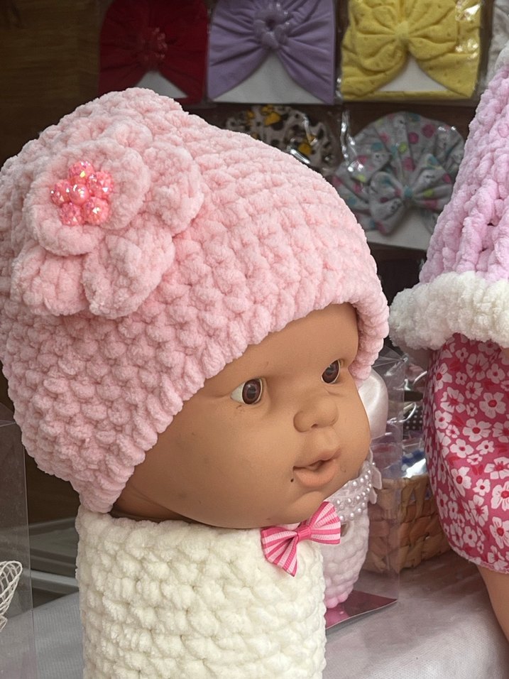 Pastel pembe renkli, nakışlı çiçek detayı bulunan yumuşak ve rahat örgü bebek bere.