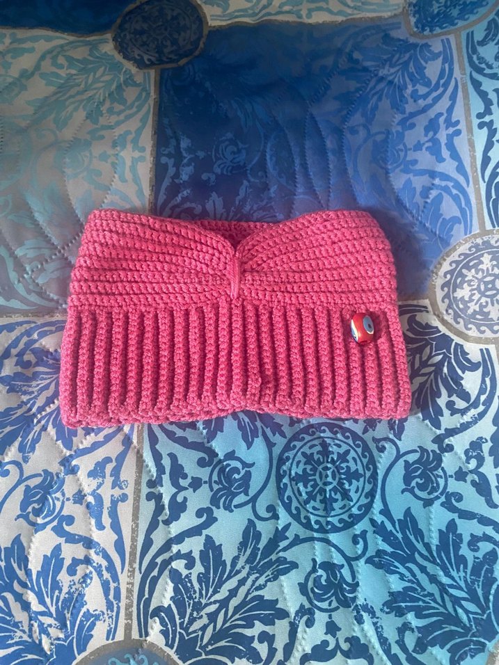 Pembe renkli, örgü dokulu bebek bere, bohem ve retro tarzıyla renkli ve rahat bir görünüm sunar.