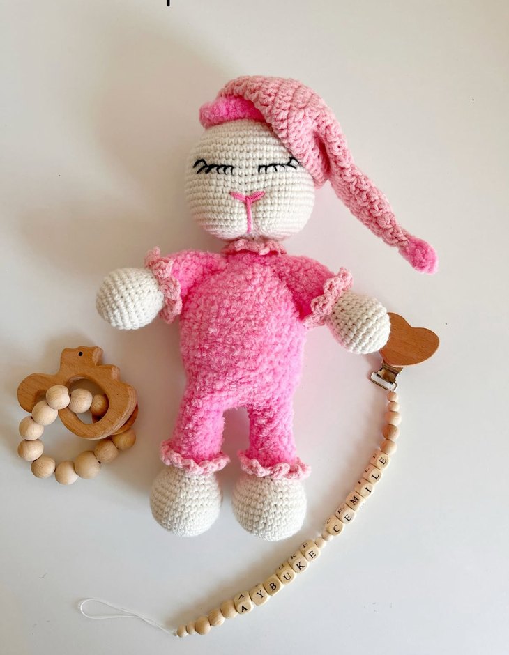 Pembe renkli, örgüden yapılmış yumuşak bebek diş kaşıyıcı ve çıngırak. Şapkalı bebek figürü ve kolay tutuş için ahşap boncuklu klips içerir.