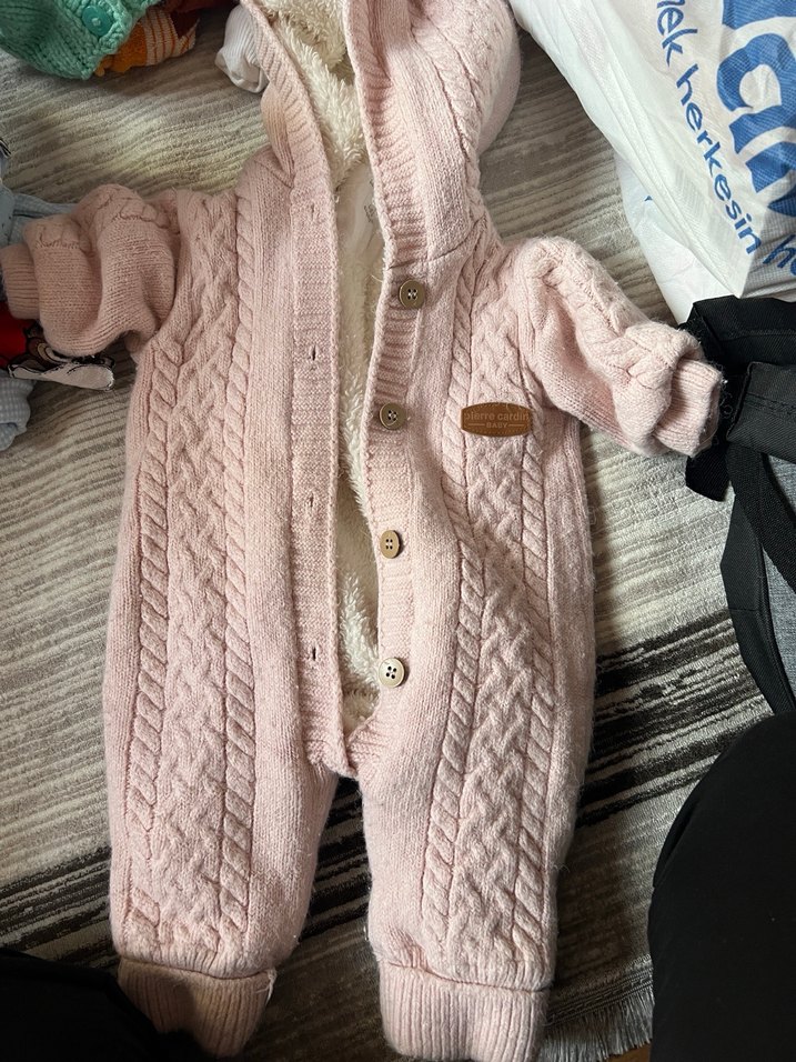 Pastel pembe renkte, örgü dokulu, yakası notched lapel tarzında bebek kış tulumu. Yumuşak ve sıcak tutar. ❄️