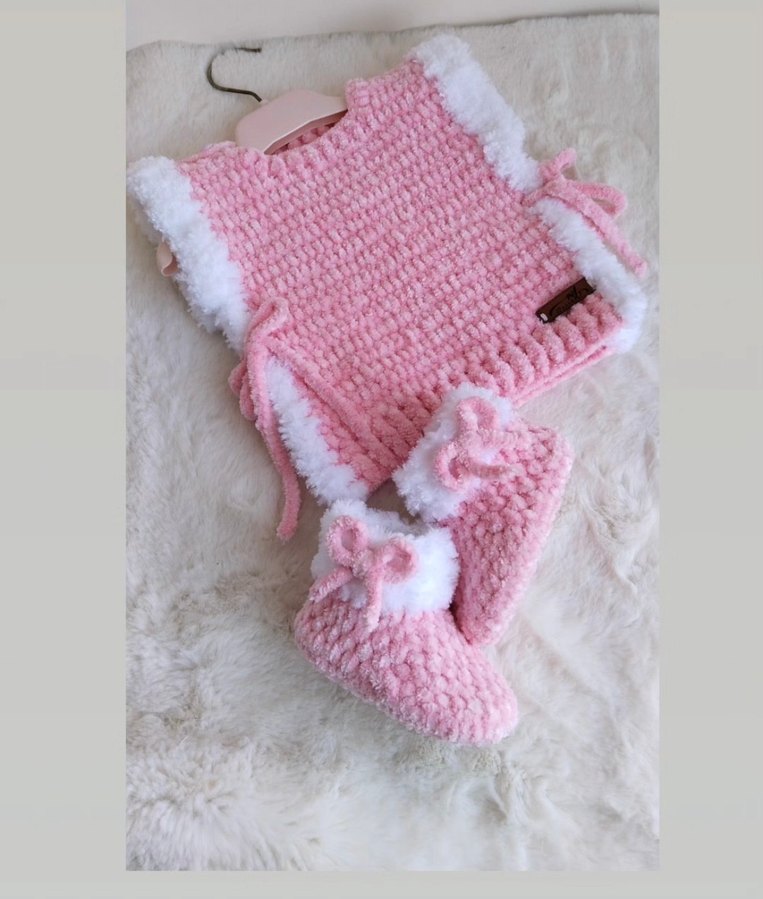 Pembe örgü bebek kız takımı, işlemeli detaylar ve yumuşak beyaz süslemelerle strappy üst ve uyumlu botlardan oluşur. Pastel renk nazik bir dokunuş katıyor. İstenilen renkte örülür bot hariç sipariş vermek isterseniz fiyat düşer bu takım fiyatıdır