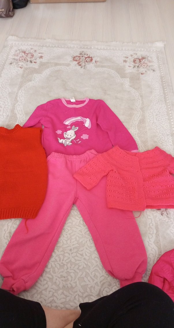 Renkli bebek kız takımı, uzun kollu pembe tavşan baskılı üst, pembe pantolon, pembe örgü hırka ve kırmızı örgü yelekten oluşur.