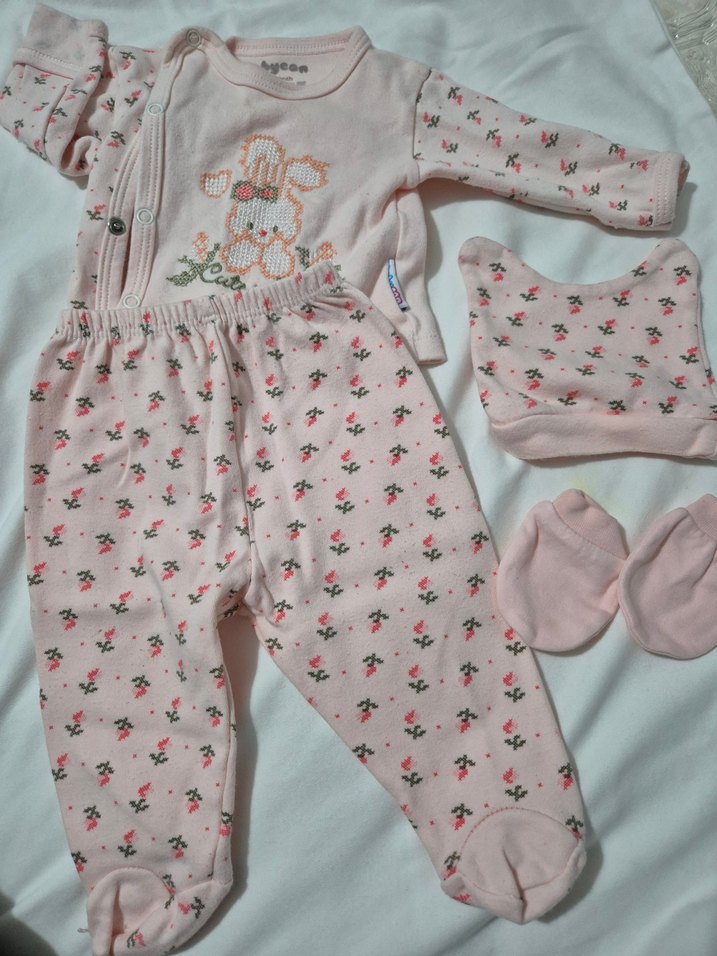 Pastel pembe renkli, örgü uzun kollu üst, sevimli tavşan desenli, çiçekli desenli pantolon, şapka ve eldivenlerden oluşan bebek kız takımı. kendinden eldivenli arti eldivende gonderiyorum gorseldeki gibi
