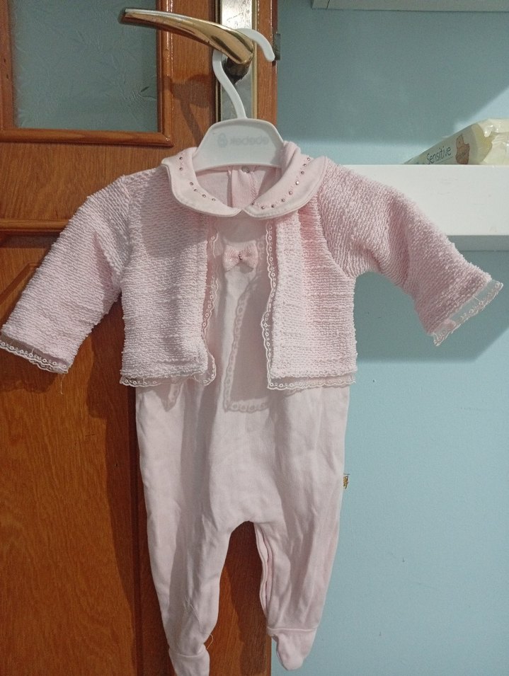 Pastel pembe renkli, uzun kollu, yumuşak yakalı örgü bebek kız tulumu. İnce detaylara ve rahat bir kesime sahiptir. arkadan cıtcıtlı 56 62 cm.yesyenı hıcbır kusuru yoktur 3 6 ay arası