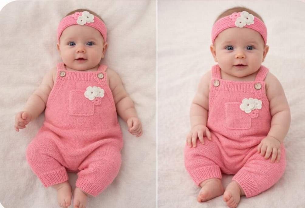 Organik pamuk ip ile örülmüş Pastel pembe renkli, düğmeli askılı ve küçük cepli örgü bebek kız tulumu, çiçekli uyumlu saç bandıyla birlikte.