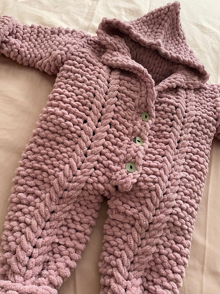 Pastel pembe renkli, örgü dokulu, düğmeli ve yakalı kapüşonlu bebek kız tulumu. Yumuşak ve sıcak tutar. ❄️