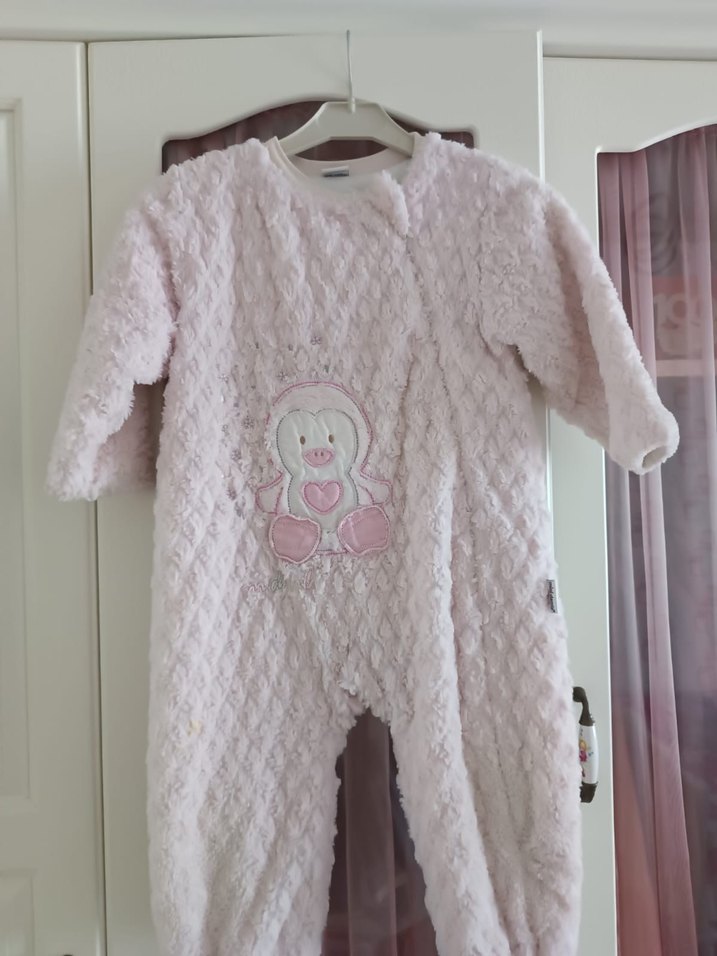 Pembe örgü kumaştan yapılmış, nakışlı desenli ve yuvarlak yakalı bebek kız tulumu, pastel tonlarda sıcak tutar. ❄️