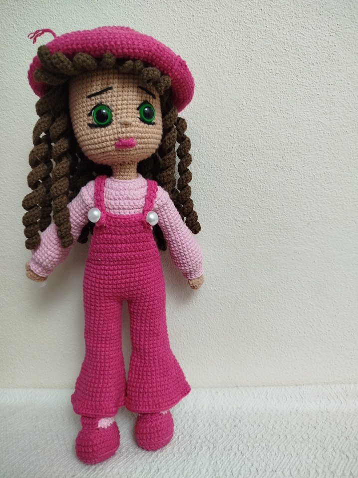 Renkli, pembe kıyafetli, örgüden yapılmış, örgülü saçlı ve yeşil gözlü oyuncak bebek. Yumuşak iplikten üretilmiştir. 32 cm boyundadır makinede yıkanabilir allerjik çocuklar için idealdir cocuklar akşam yatarken de yanında yatıyor