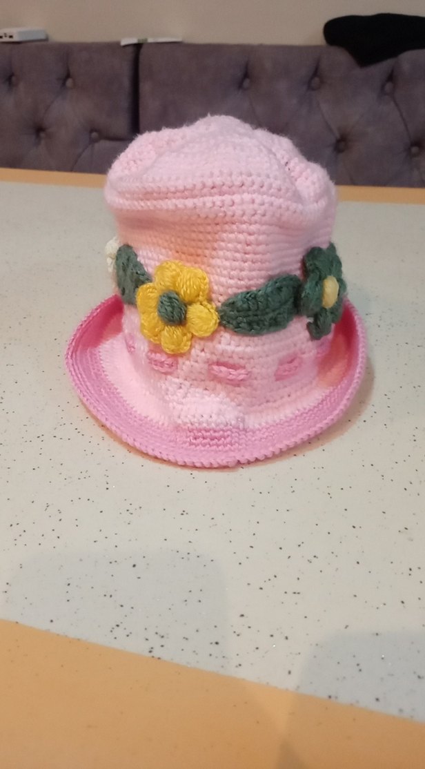 Pembe örgüden yapılmış, renkli çiçek detaylı bohem tarzda, yumuşak ve rahat bir bebek şapkası
