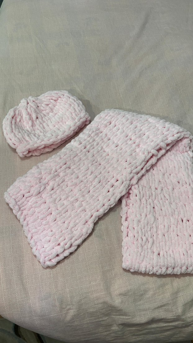 Pastel pembe renkte, örgü bere ve atkı seti. Düz ve yumuşak dokusuyla rahat kullanım sağlar.