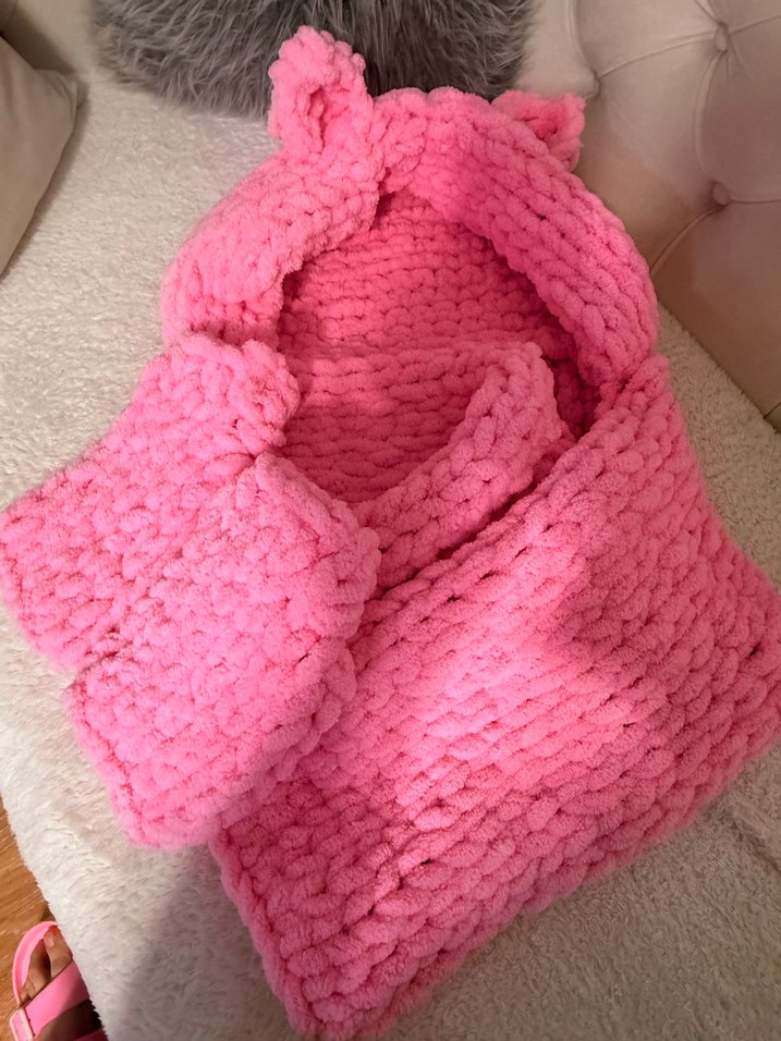 Pastel pembe renkte, düz desenli, yumuşak dokulu çocuk örgü bere ve atkı seti.
