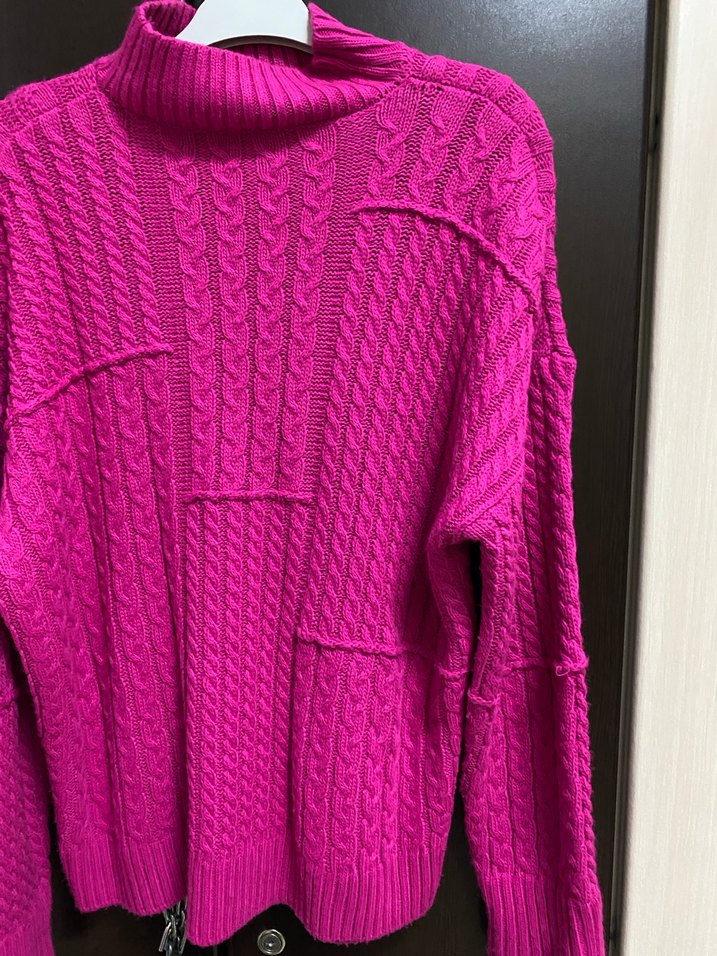 Pembe örgü kadın kazak, boğazlı ve uzun kollu olup, bol kesimdedir. Rahat, desensiz tasarımıyla günlük kullanıma uygundur.