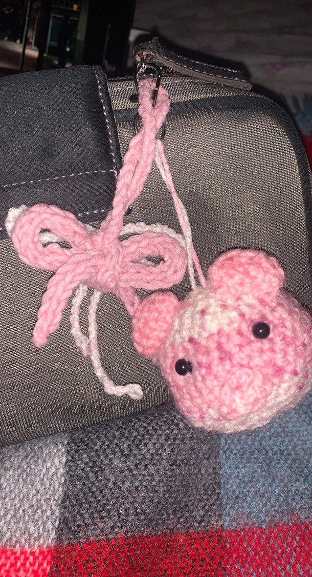 Pembe örgü malzemeden yapılmış, bohem tarzda sevimli bir fiyonk ve yuvarlak süs içerir. Anahtarlarınıza veya çantanıza retro ve rahat bir dokunuş katar.