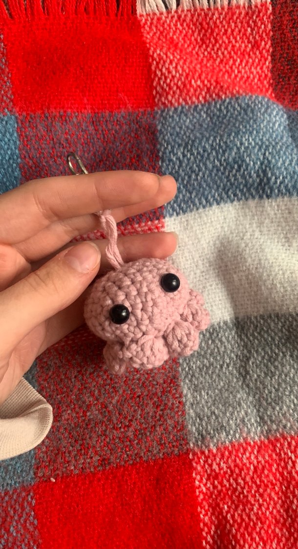 Pembe pastel renkli, örgü tasarımlı, bohem ve rahat tarzda anahtarlık. Retro ve hippie dokunuşlar içerir.