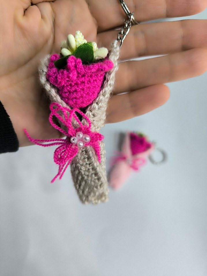 Pembe örgü malzemeden yapılmış, boncuk detaylı küçük çiçek demeti şeklinde renkli bohem tarzında anahtarlık.
