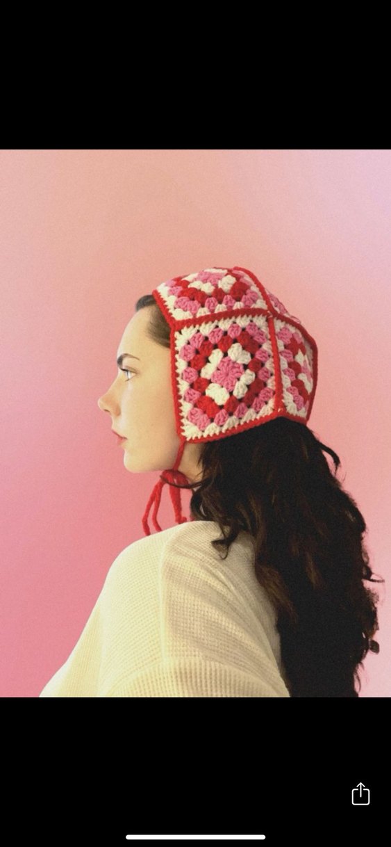 Pastel pembe örgü bohem tarzda, retro ve hippie esintili saç bandı. Çene altından bağlanır, şık ve rahat.