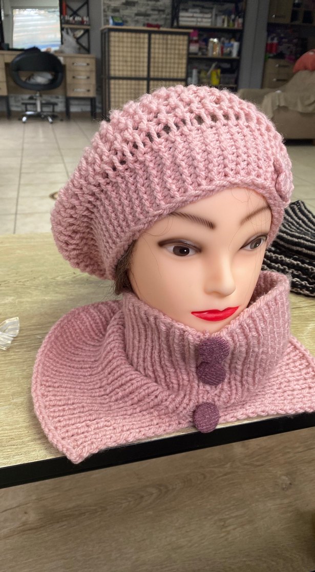 Pembe örgü bohem tarzı kadın bere ve düğmeli boyunluk seti, rahat ve şık bir görünüm sunar.