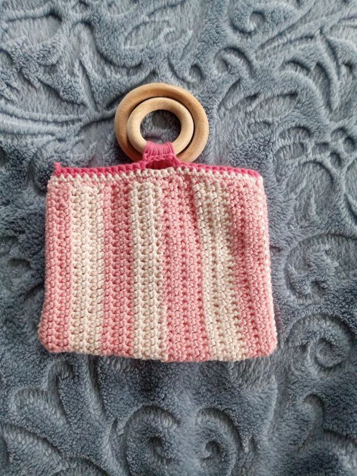 Pembe ve krem pastel çizgilerle örülmüş çocuk çantası. Ahşap halka saplı, rahat ve retro bohem tarzda, en 16 cm boy 13cm