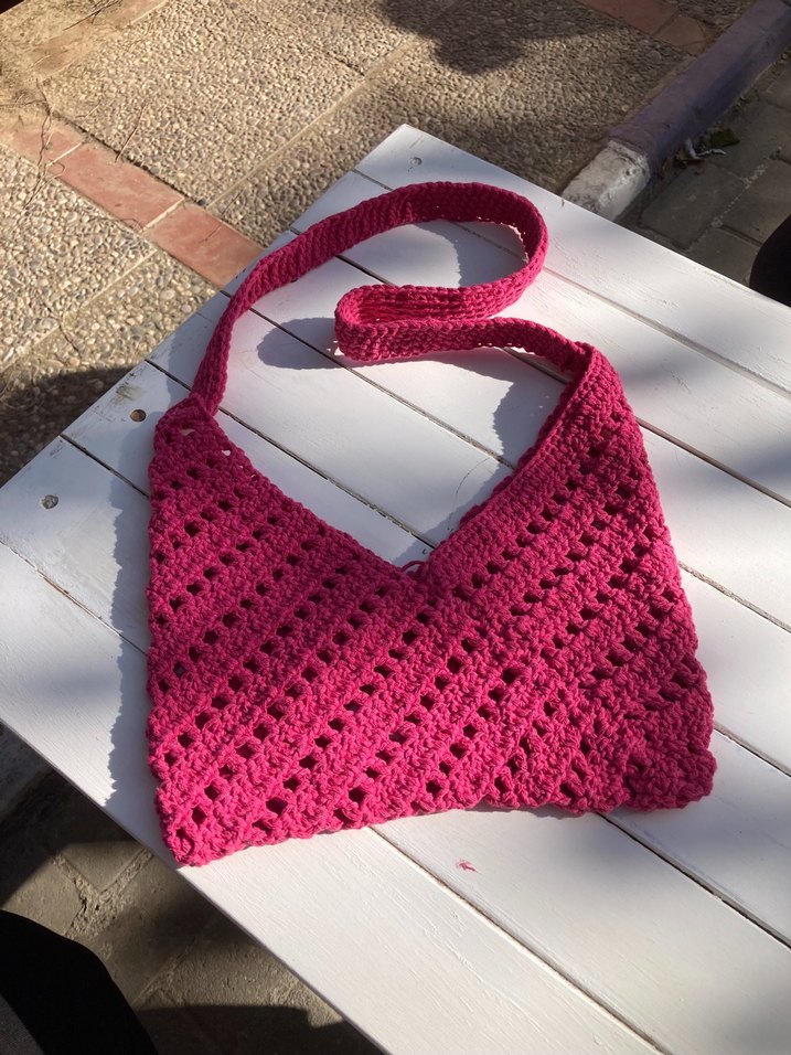 Pembe örgü kumaştan, dantel detaylı bohem tarzda kadın çantası. Renkli ve rahat askılı, günlük kullanıma uygun. Marka temsilidir.