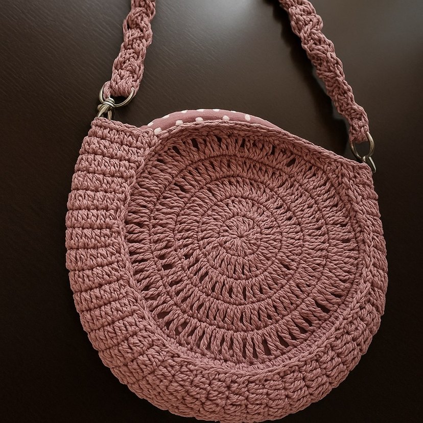 Yuvarlak şekilli, dantel detaylı pembe örgü çanta, bohem tarzı yansıtır, günlük kullanım için uygundur.