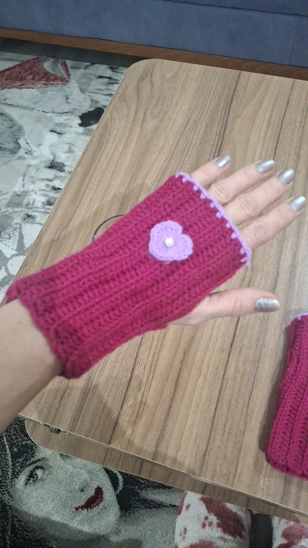 Pembe örgü kadın eldivenleri, küçük kalp detaylı, bohem tarzda sıcak ve renkli bir görünüm sunar.