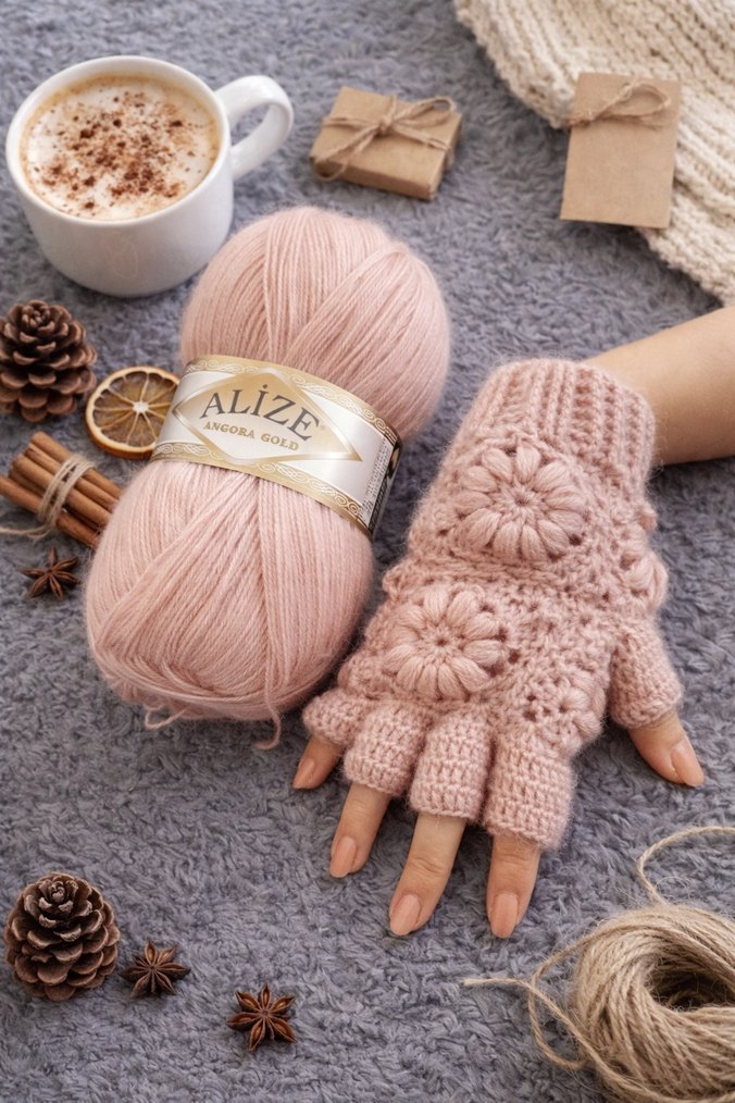Pastel pembe renkli, çiçek desenli örgü bohem tarzda kadın eldiveni. Rahat ve retro bir görünüm sunar. İplikte "ALiZ" markası bulunur.