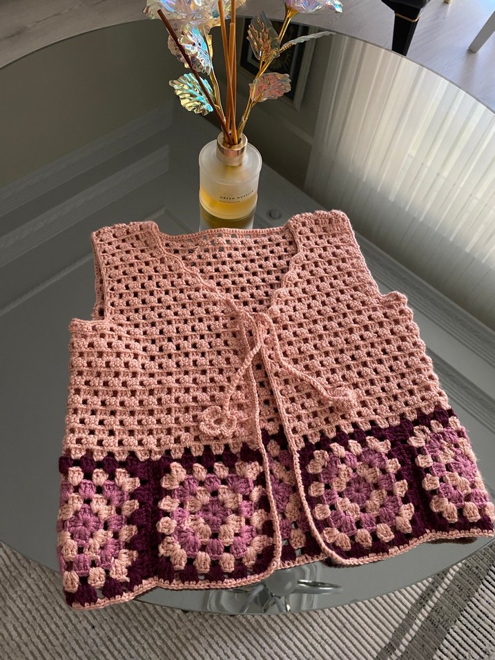 Örgü dokulu, askısız ve salaş kesim pembe yelek, bohem tarzda retro desenlerle günlük kullanıma uygun rahat bir parça.