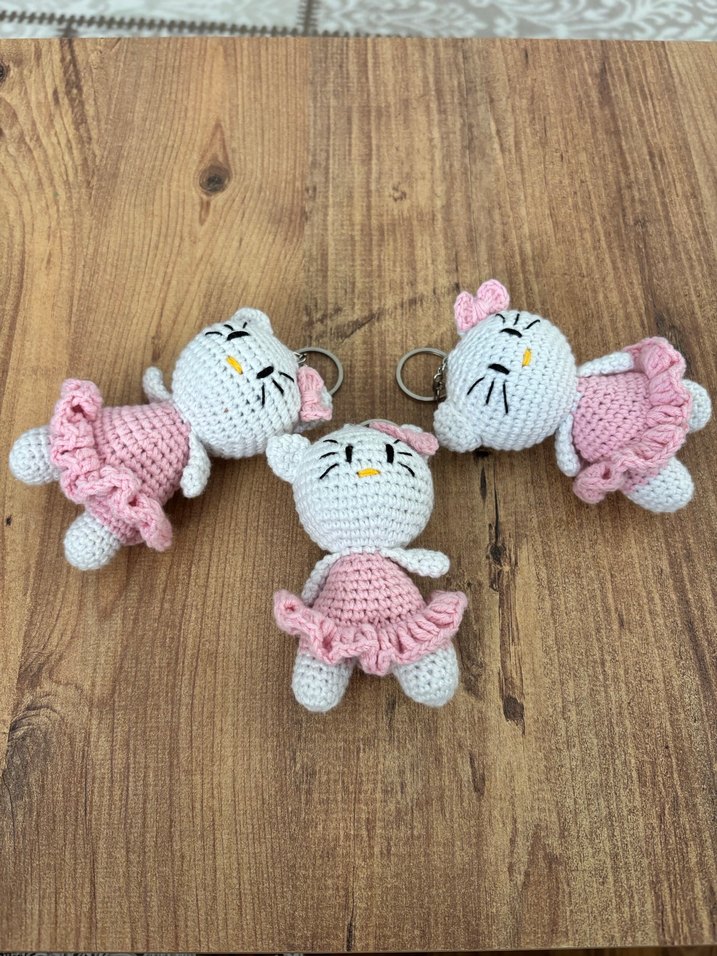 Renkli pembe örgüden yapılmış, bohem tarzda sevimli kedi figürlü anahtarlıklar, anahtarlarınıza sıcaklık katar. Üçlü fiyat