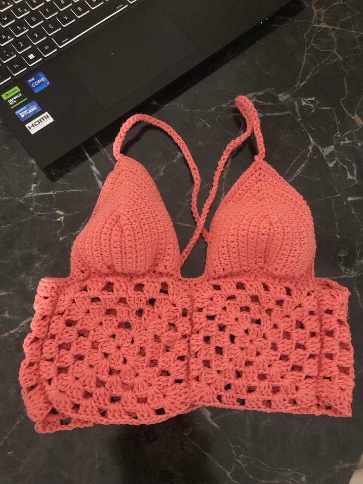 V yaka ve askılı pembe, örgü, kısa ve fitted bohem tarzda rahat bir mini büstiyer. 75 b beden sıfır ürün
